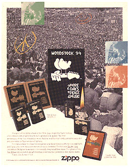 Près de 200 000 G.I’s feront de Zippo un moyen d’expression intime, révélateur de l’état d’esprit de ces oubliés célèbres du bout du monde. En 1972, aux États Unis Woodstock sera l’apogée d’un mouvement inverse, prônant les valeurs opposées ; de partage, d'amour et de paix. Dès lors, les séries se succèdent, illustrant évènements, thématiques à la mode et commémorations. |