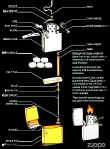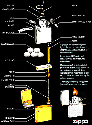 Une fois poli, il peut subir jusqu’à 37 étapes de traitement et de finitions. Le mécanisme intérieur est façonné à partir d’une feuille d’acier de 0,45 mm, mise en forme puis soudée. Cet élément est fermé en haut par une plaque soudée elle aussi et percée de 2 trous : l’un pour le passage de la mèche, l’autre pour celui de la pierre. Ce tube est garni de boules de rayonne maintenues par un feutre d’ouate. La qualité de ce garnissage optimise l'autonomie du Zippo. Cette fabrication inchangée depuis 60 ans subit une ultime vérification avant de partir vers d’autres ateliers pour y être ensuite décorée. |